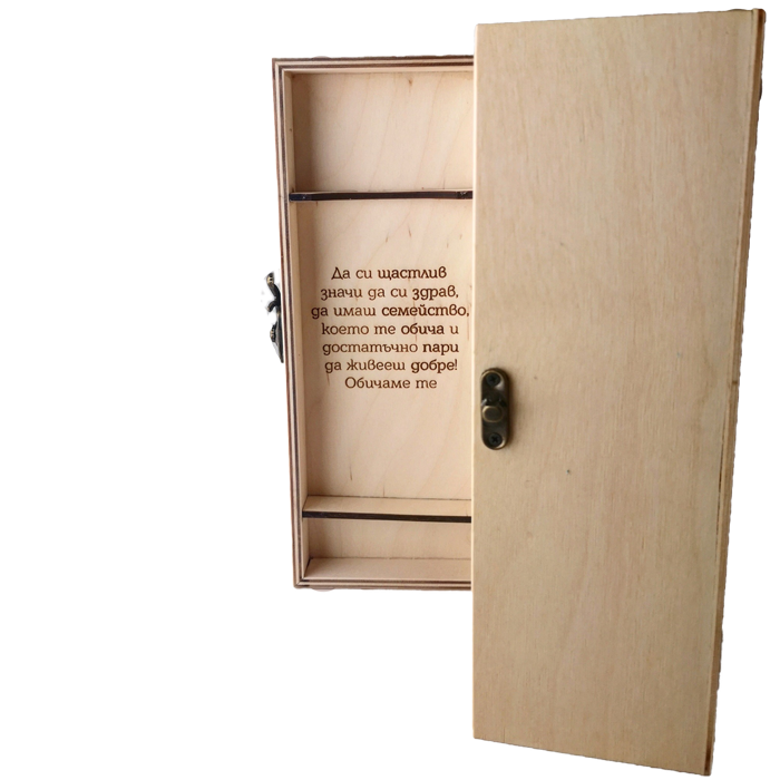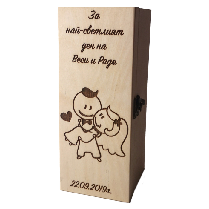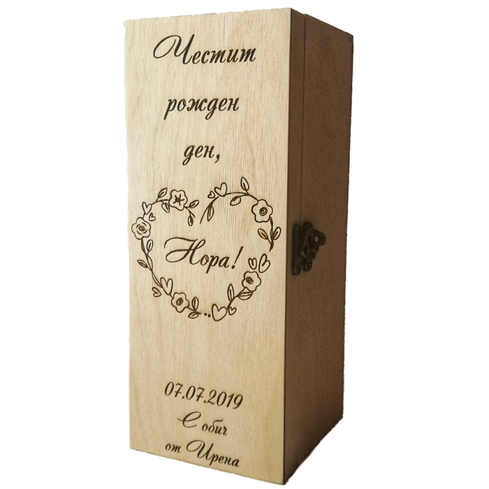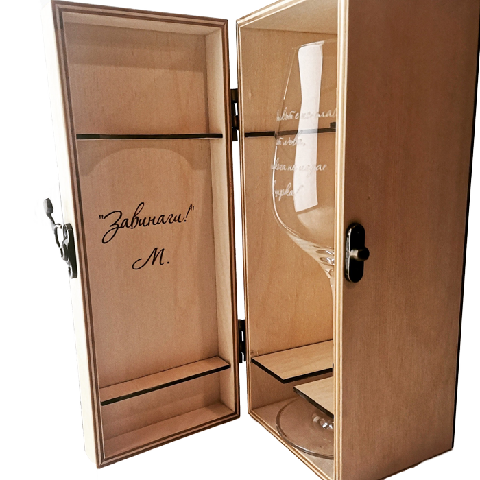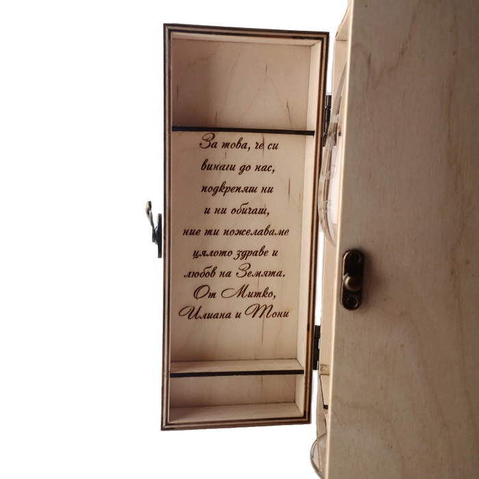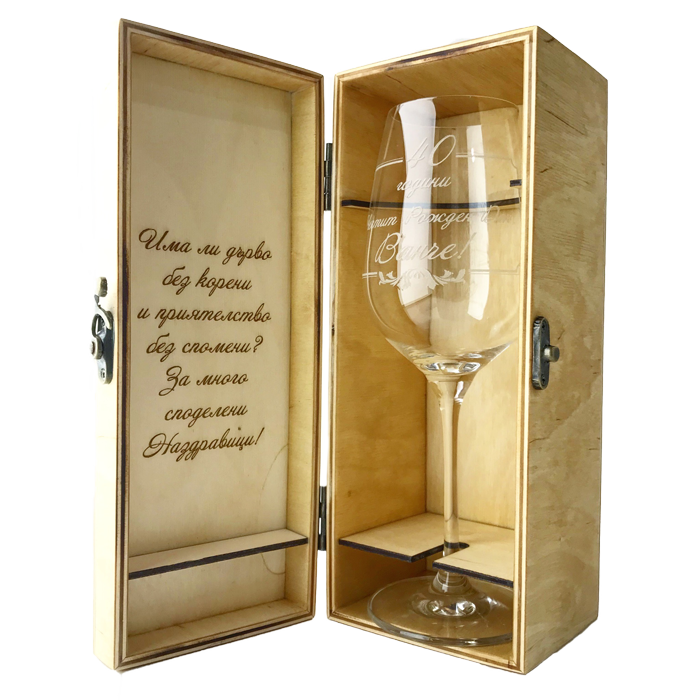 Създайте стилен и изискан подарък с нашия комплект от дървена кутия и чаша за вино. Този комплект е идеален за специални поводи и включва възможност за персонализация, която го прави още по-личен и значим.