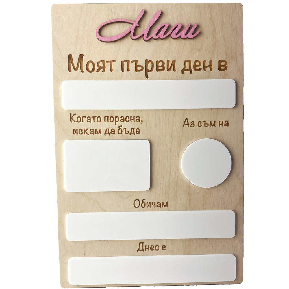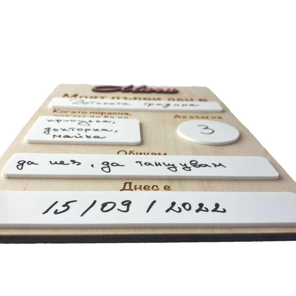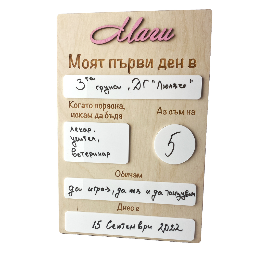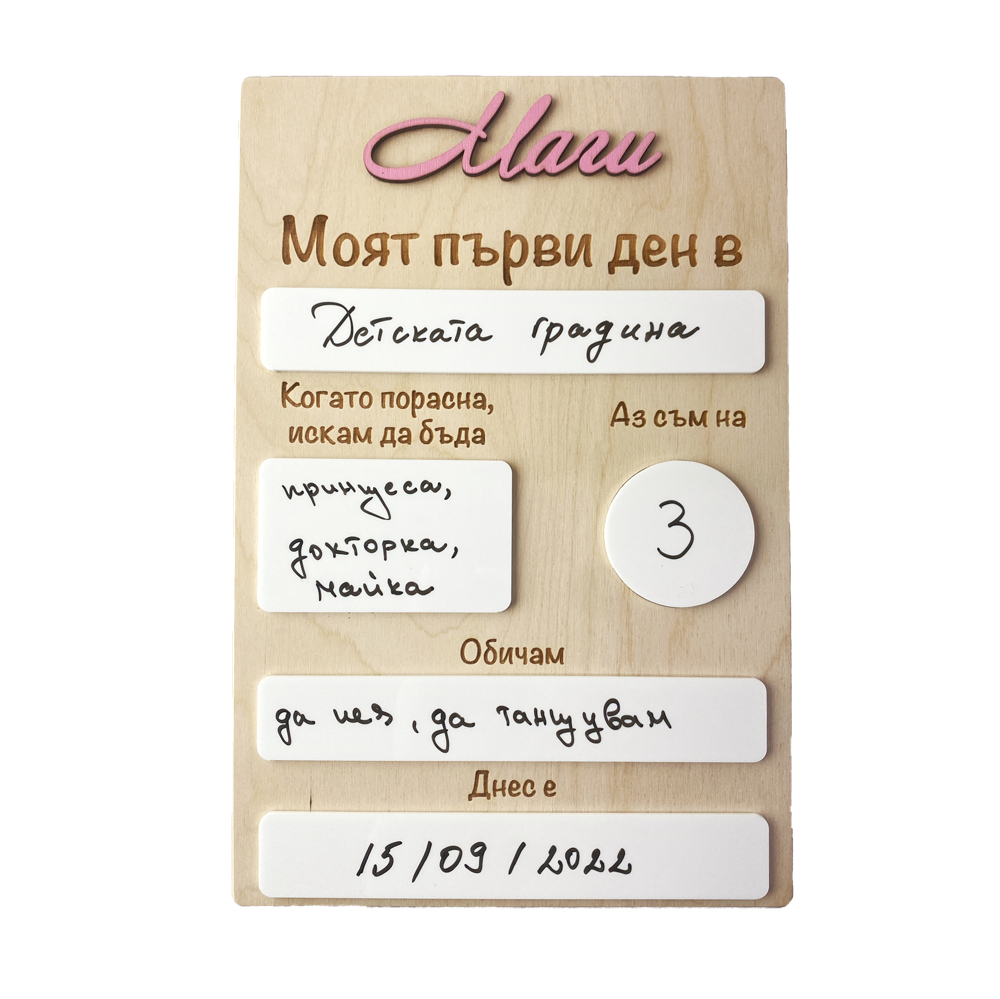Запечатайте специалния момент на първия учебен ден или друг важен повод с нашата дървена табела "Моят първи ден". Тази табела е идеалният начин да съхраните спомените и да ги направите още по-уникални.
