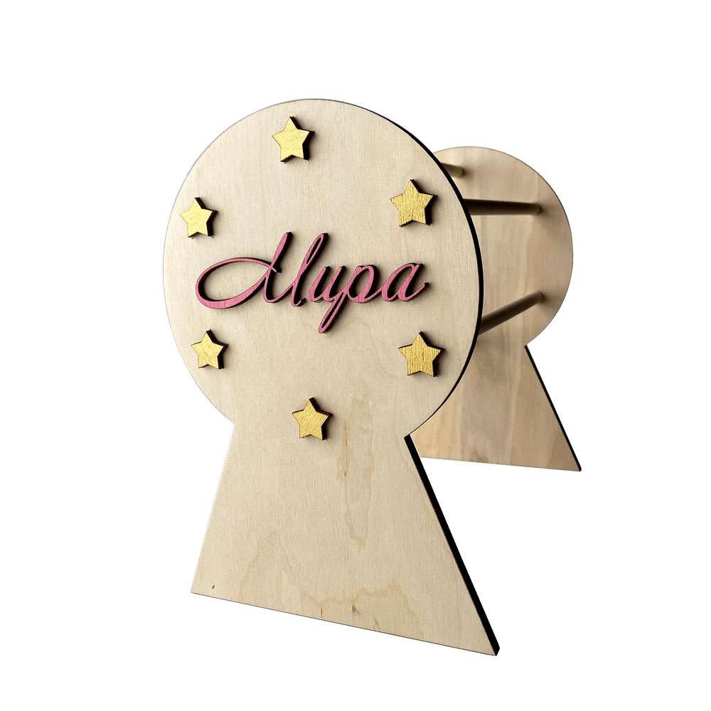Поставка за диадеми с уникален дизайн, включващ четирилистна детелина от едната страна и персонализирано име от другата. Тази поставка е стилно и практично решение за съхранение на диадеми, като същевременно добавя индивидуалност към декора.