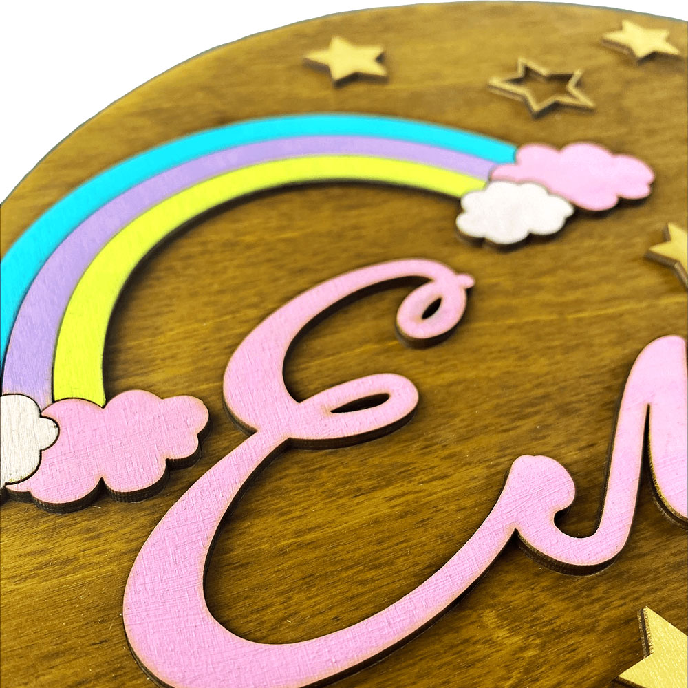 Внесете магия и цвят в детската стая с нашата табела звезди и дъга, изработена от висококачествен шперплат. Тази красива табела е идеална за декорация и може да бъде персонализирана с надпис по ваше желание.