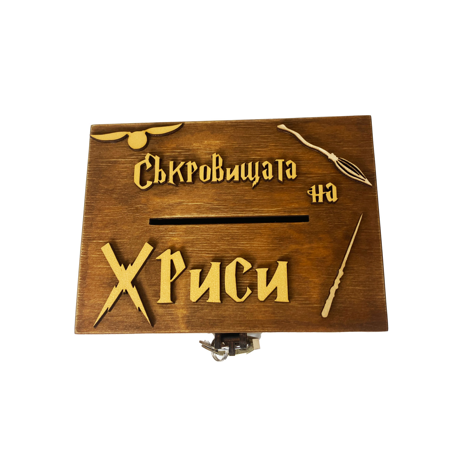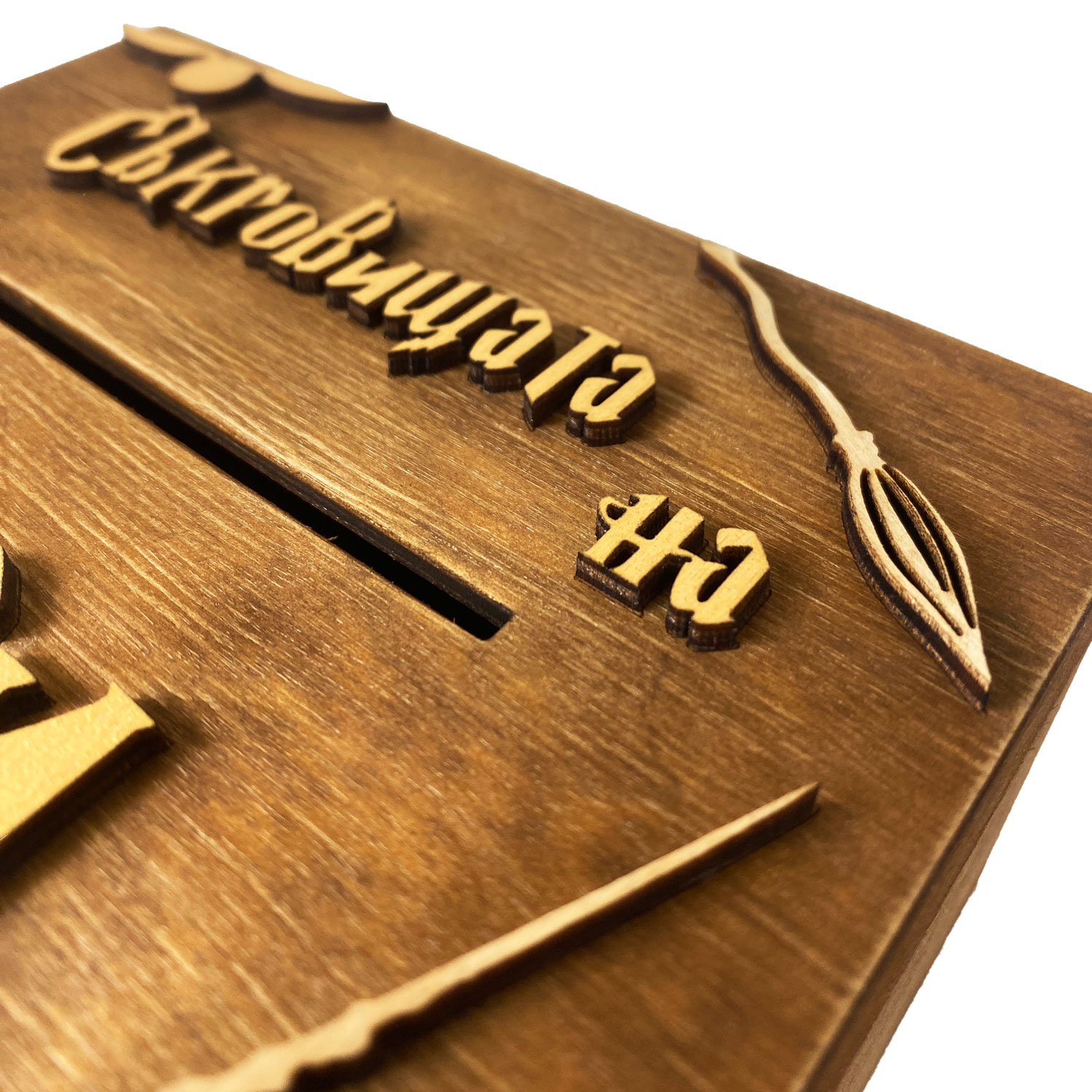 Тази уникална дървена касичка е вдъхновена от магическия свят и е идеалното място за съхранение на спестявания и малки съкровища.