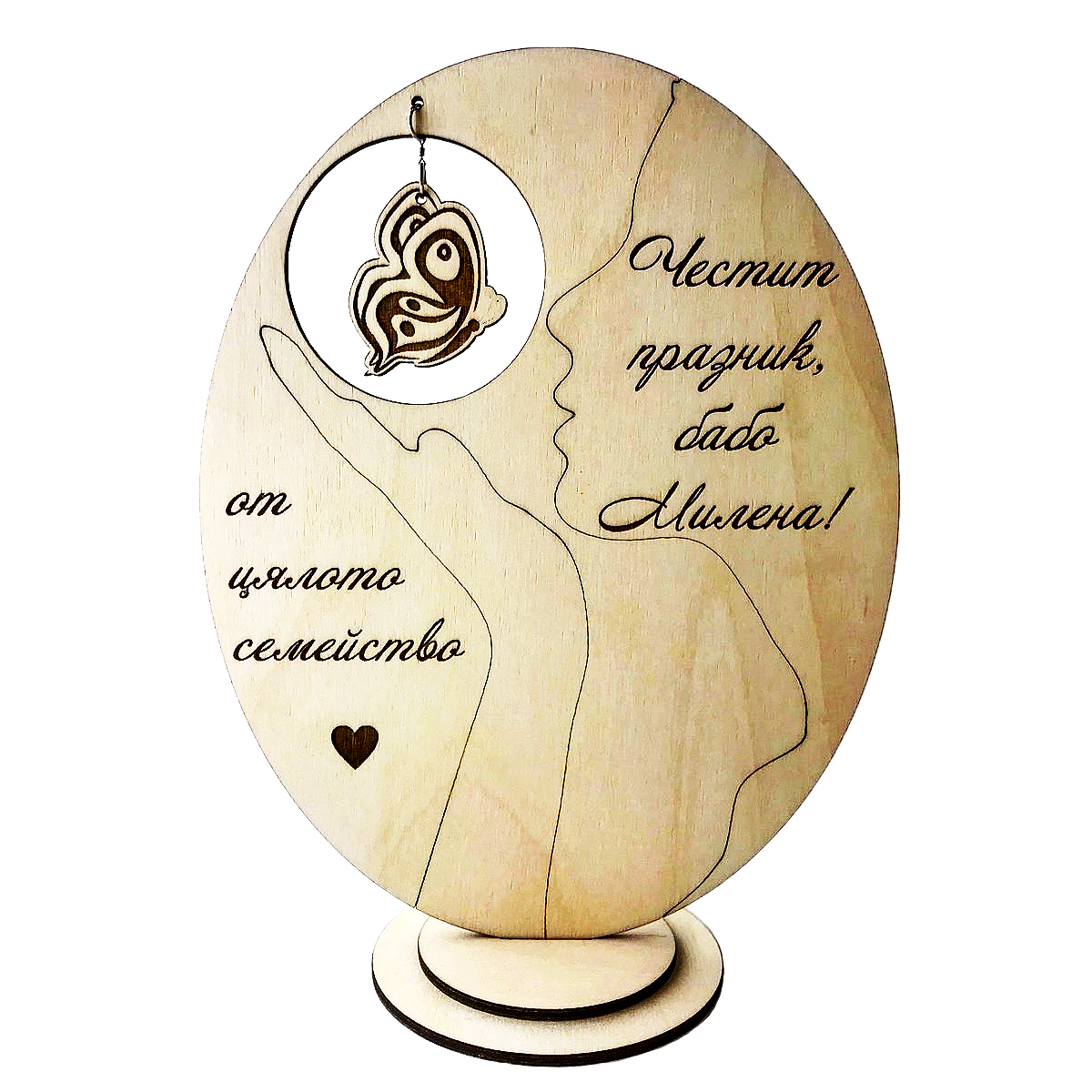 Това дървено изделие съчетава елегантност и символика, което го прави перфектен избор за подарък или декорация.