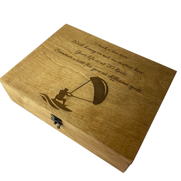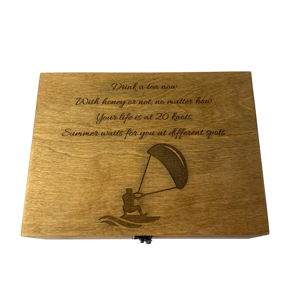 Тази дървена кутия за чай съчетава практичност и елегантност, добавяйки индивидуалност към вашата кухня или подарък.