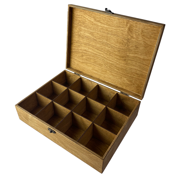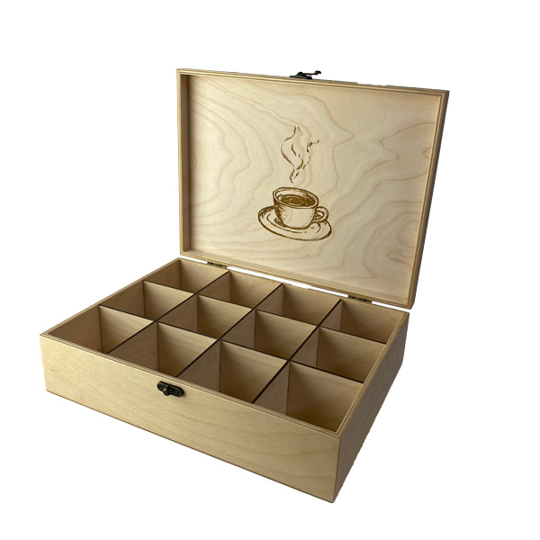 Организирайте вашите любими чайове стилно с нашата голяма дървена кутия за чай с 12 разделения. Тази елегантна кутия е идеална за съхранение и може да бъде персонализирана с гравиране.