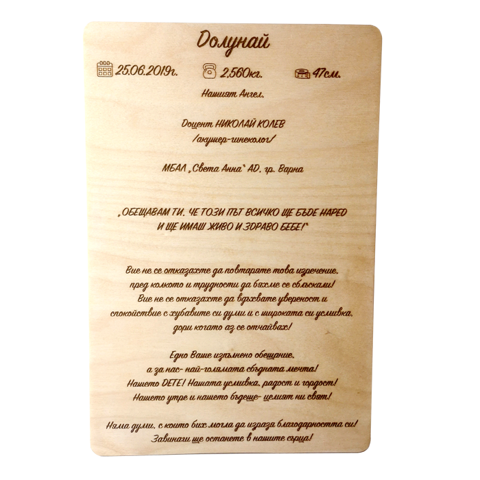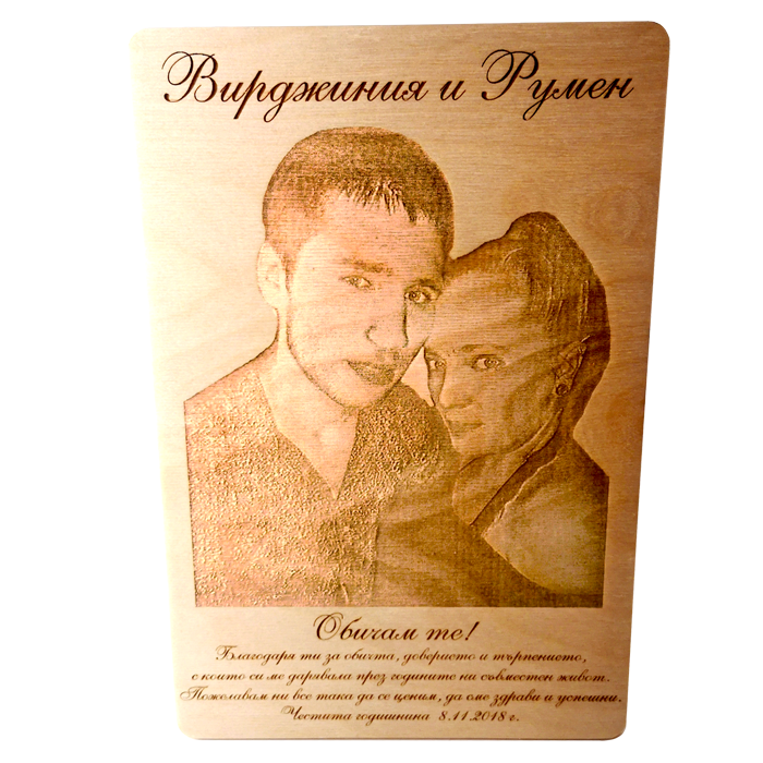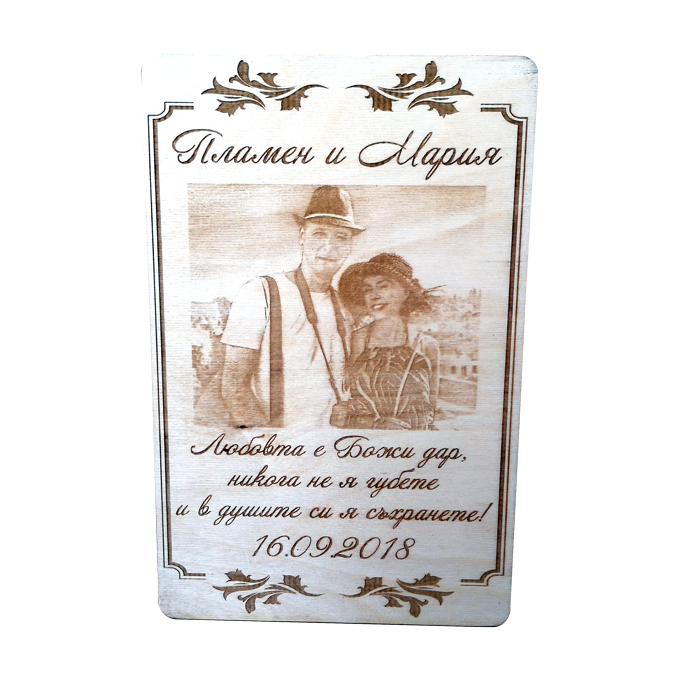 Създайте впечатляващ спомен с нашето дървено пано със снимка в размер 30x20 см, гравирано с внимание към детайлите. Това пано е идеално за декорация или подарък, който ще запази вашите най-ценни моменти.